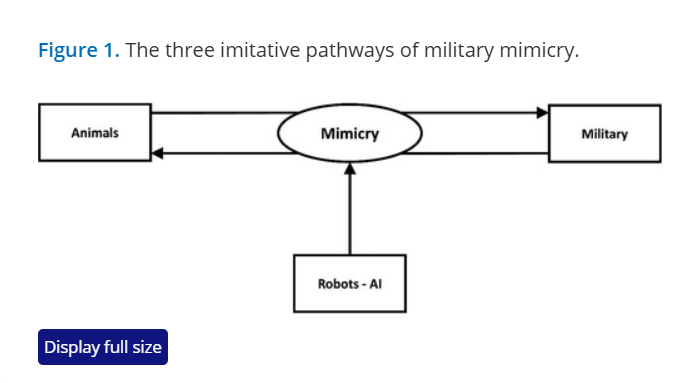 The focus of this paper is on mimicry. It is a concept that has attracted substantial academic enquiry in the biological world, leading to a wealth of scholarship. Examination of the fascinating biomimicry processes provides the taxonomy for this study on the applied subject of military mimicry. There are, we posit, three elements to military mimicry: firstly, concealment – normally reflected through camouflage to conceal military assets; secondly, deception – reflecting the evolution of “dummy” military assets, often to encourage the enemy to attack, reveal their positions, and quickly be destroyed as a consequence; and, thirdly, imitation. The final element in this taxonomy is the most complex, as it can be decomposed into three further subfields of analysis. To begin, there is animal imitation of military tasks, such as WWI pigeons replacing the role of military runners. In reverse, there is also military emulation of animal performance through bioengineering, including the adaption of cockroaches and ants for military purposes. Finally, as armed forces become immersed in Artificial Intelligence (AI) and robotics, there is the unfolding phenomenon of these technologies, including swarms, avatars, neuroscience, and genomics, mimicking military forces and assets in the pursuit of twenty-first Century warfare. These three imitative pathways are illustrated in Figure 1, below.